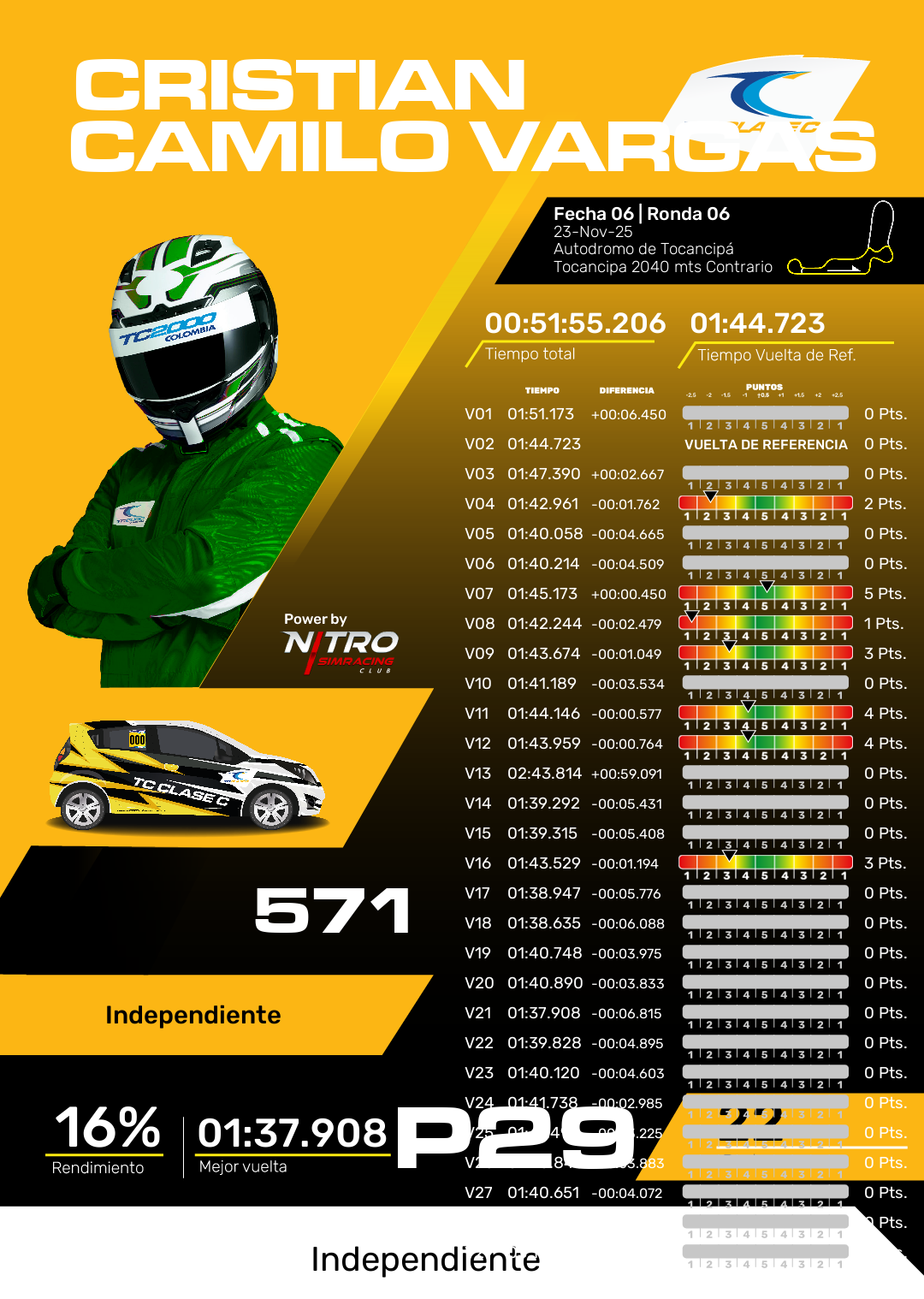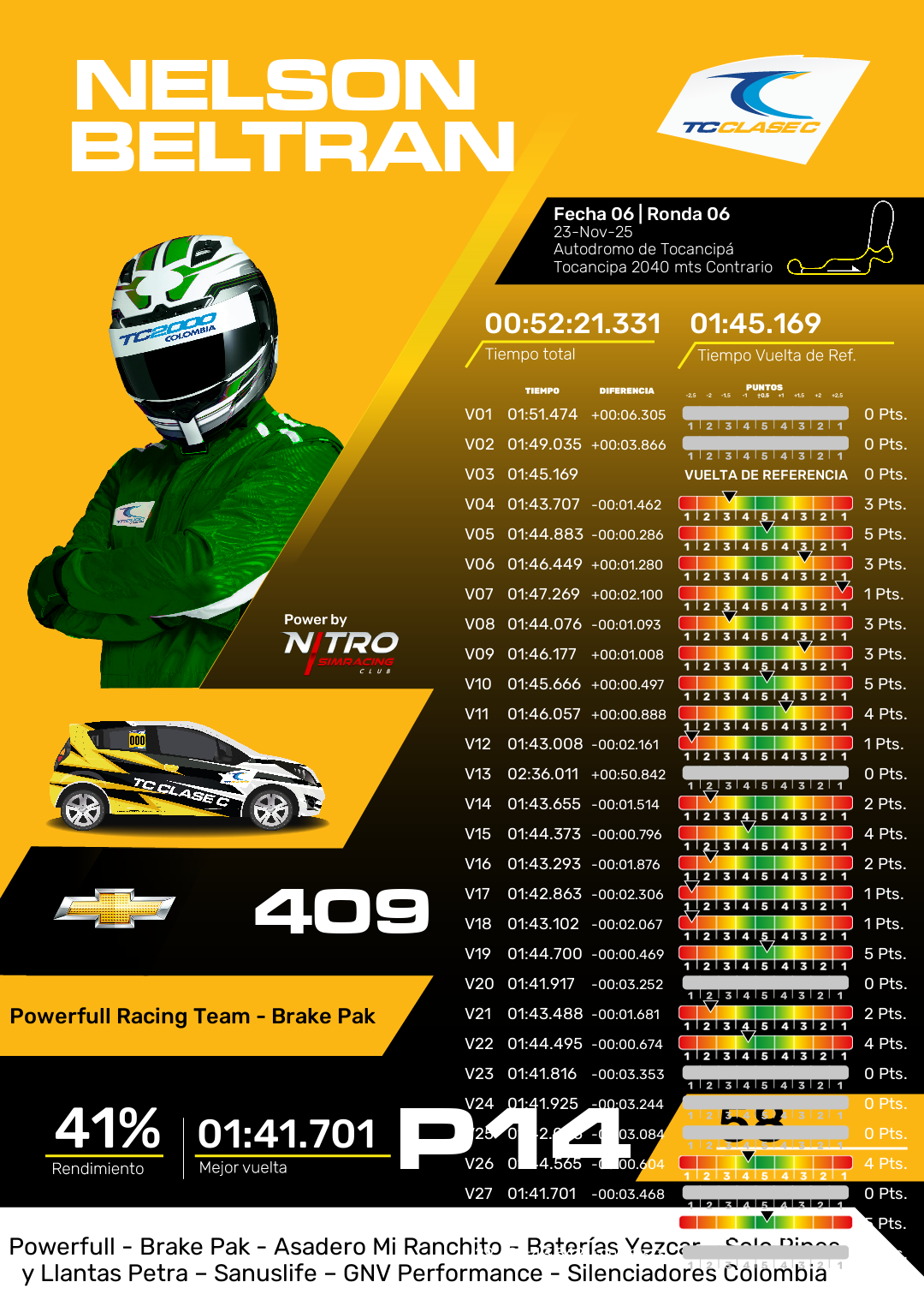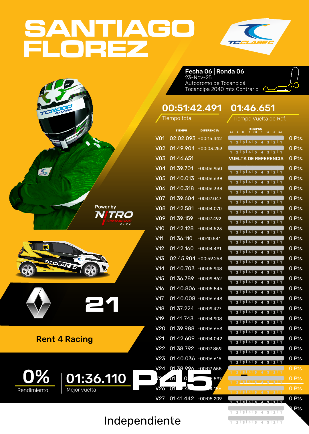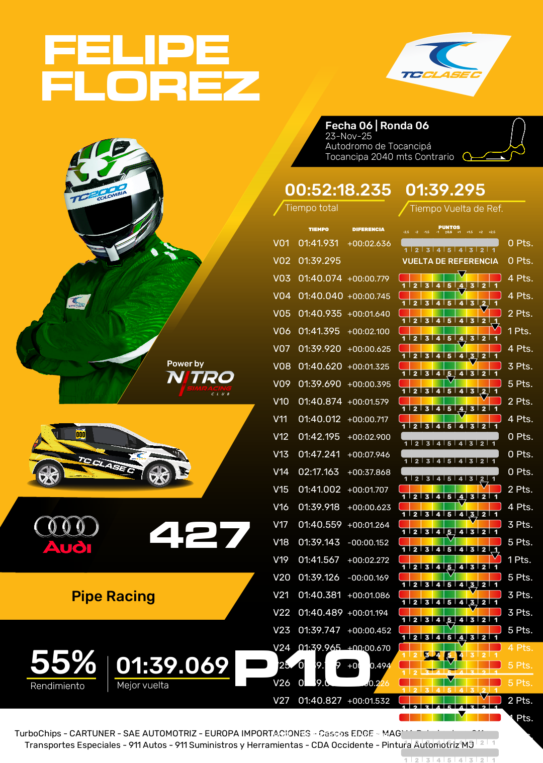 | Pos | #Coche / Auto | Piloto | Equipo | #V | T.Total | Giro V.Ref | Tiempo V.Ref | % Óptimo | Rendim | G.Punt | Prom.Giros | Pts | VER |