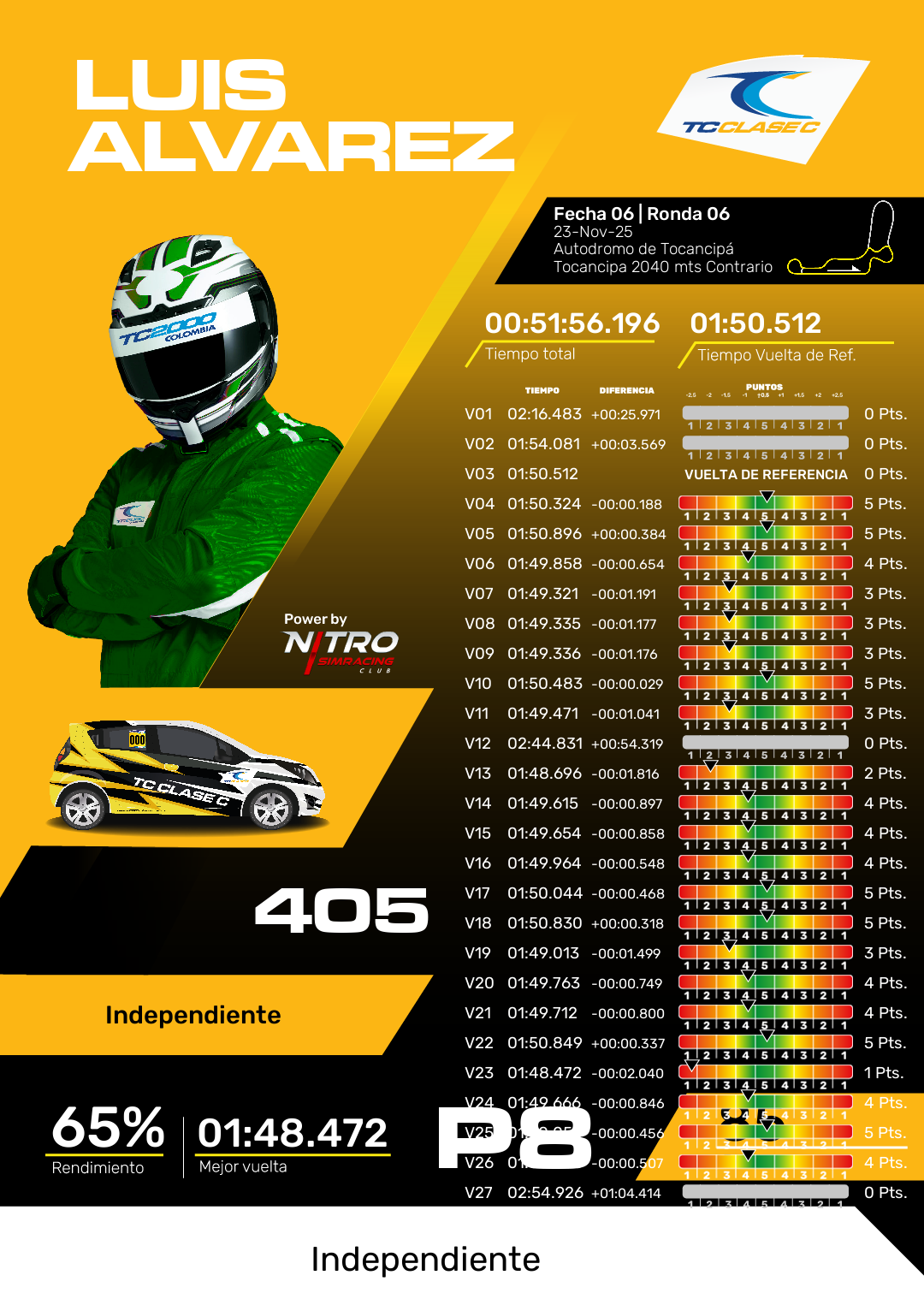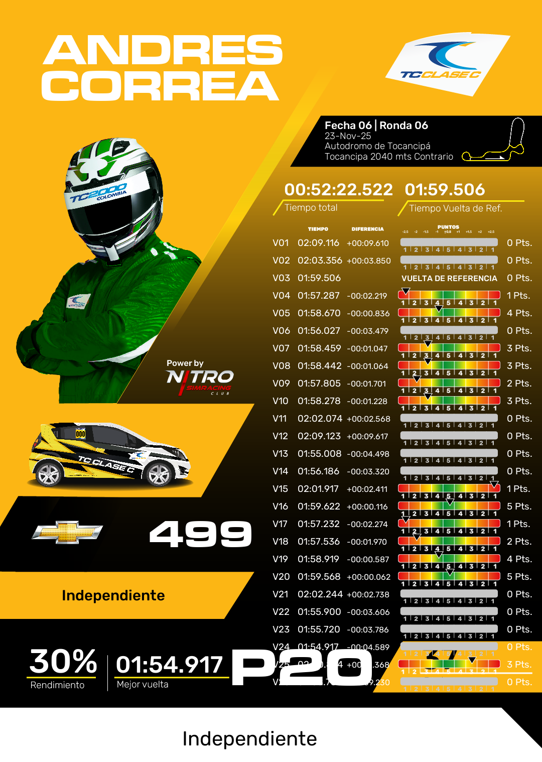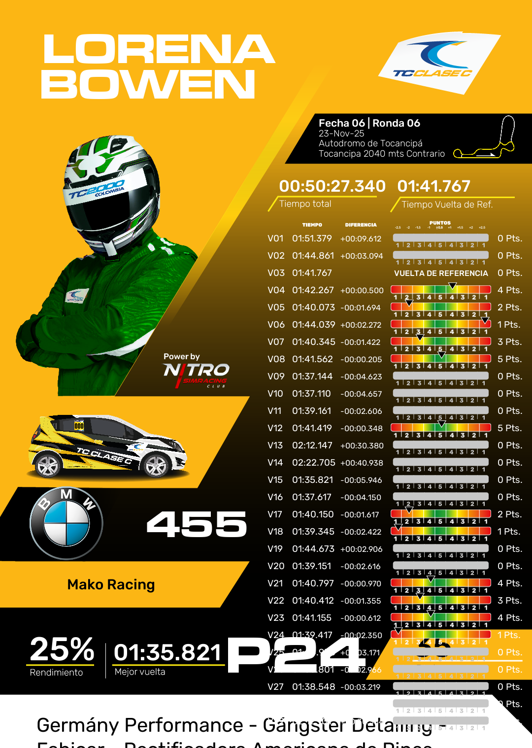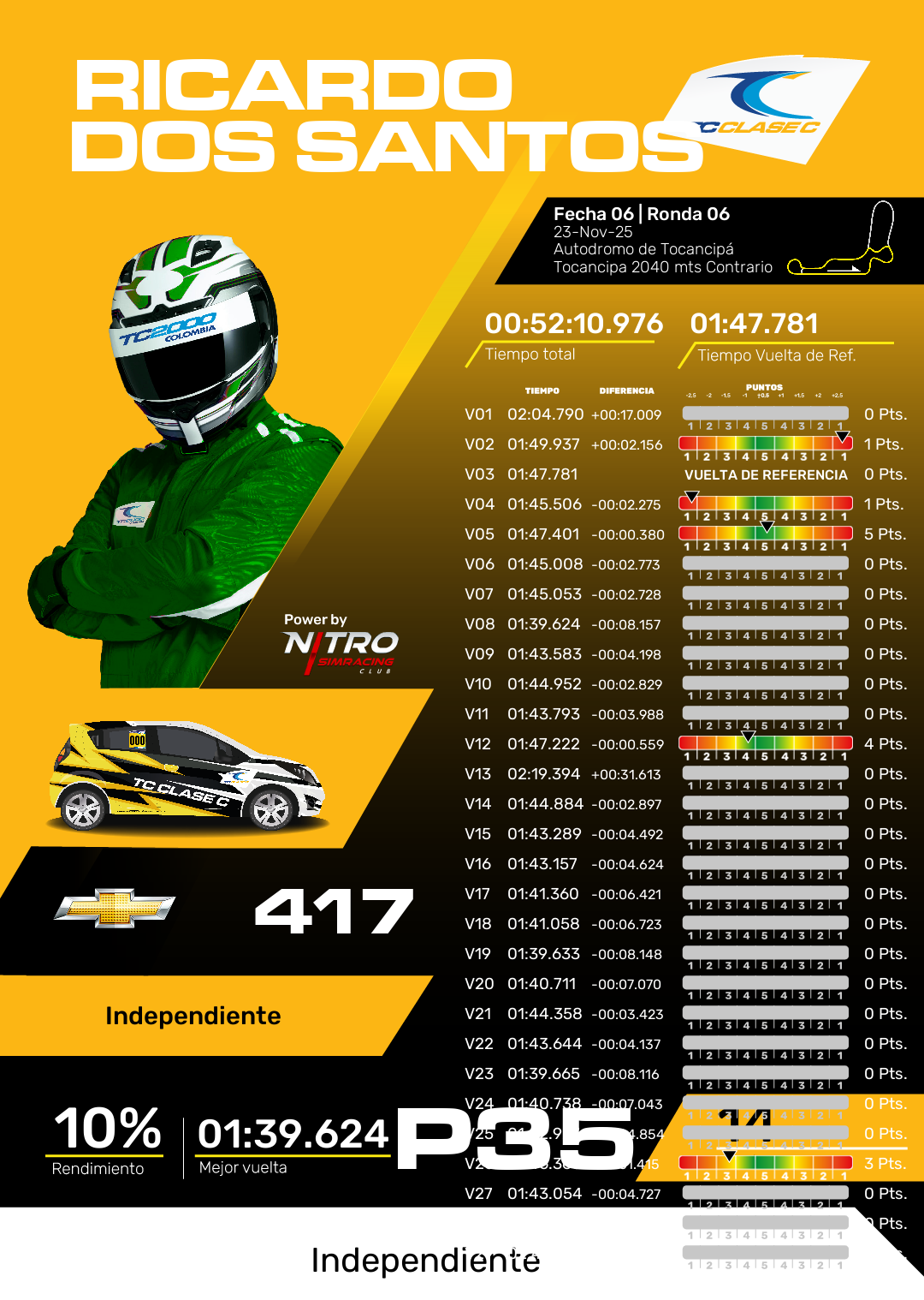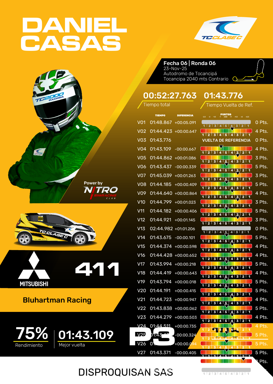 | Pos | #Coche / Auto | Piloto | Equipo | #V | T.Total | Giro V.Ref | Tiempo V.Ref | % Óptimo | Rendim | G.Punt | Prom.Giros | Pts | VER |