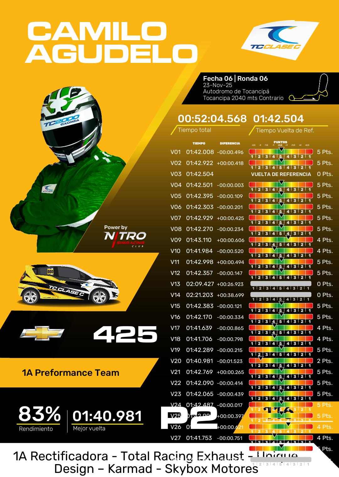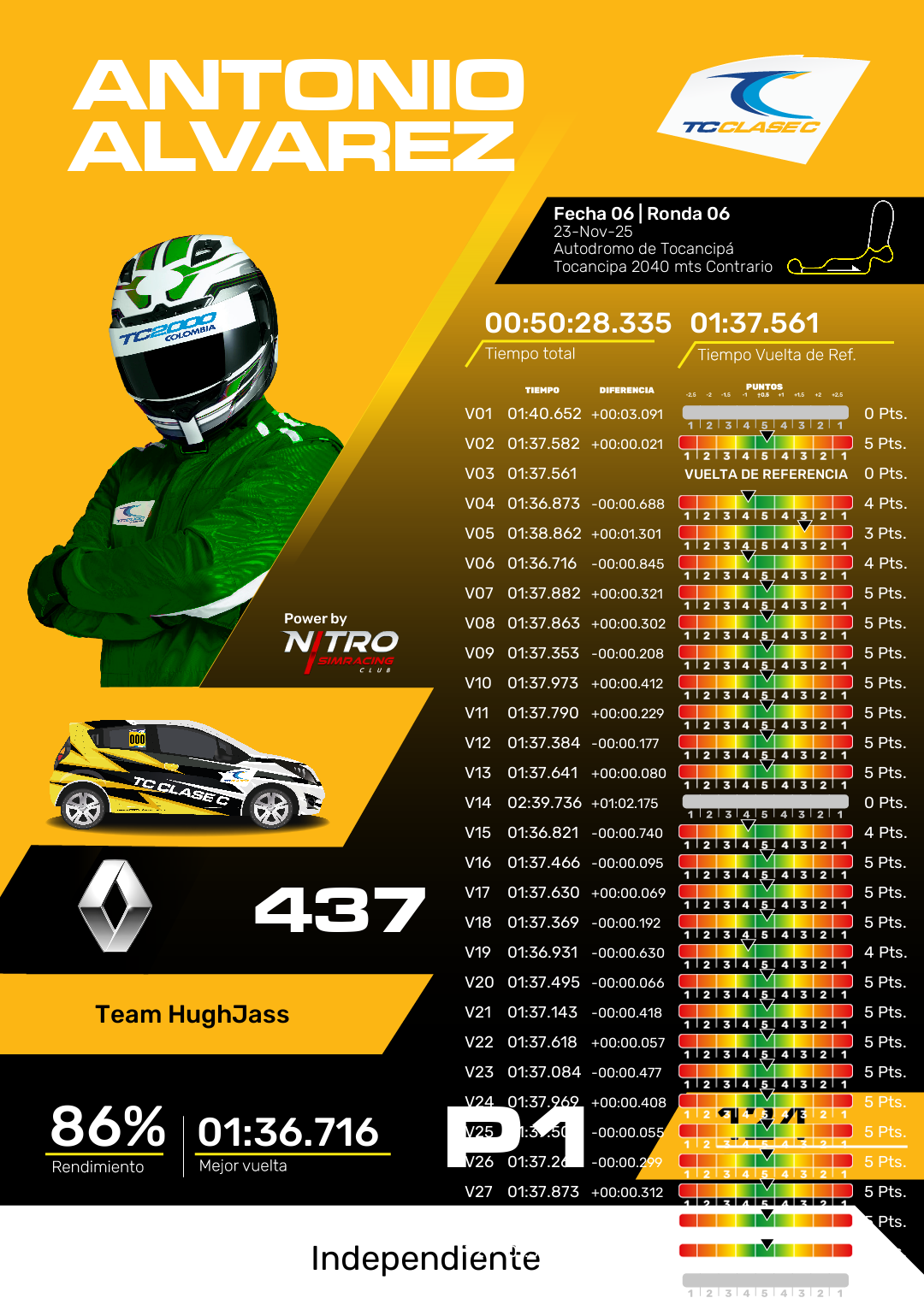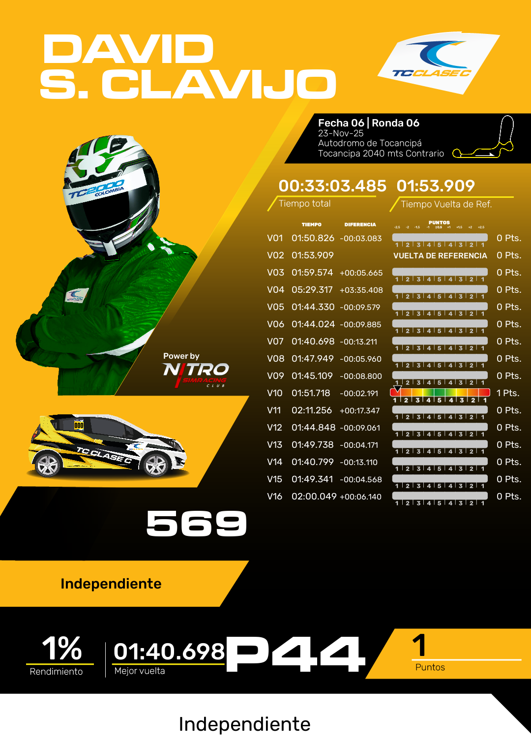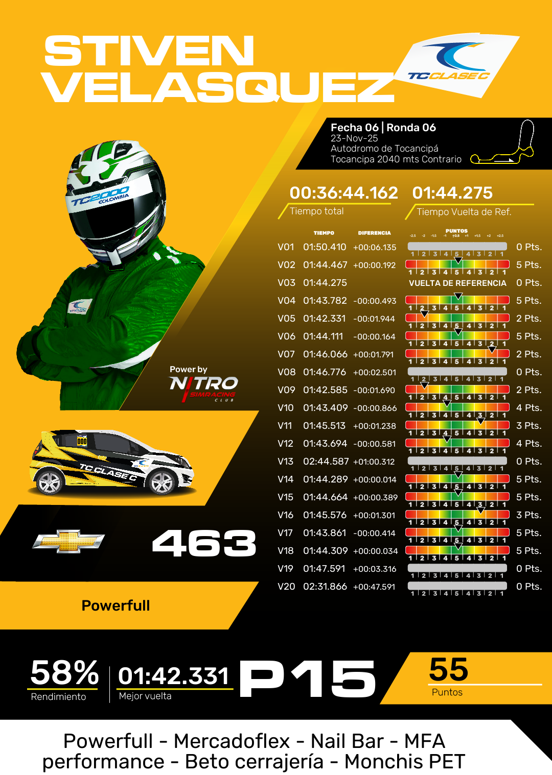 | Pos | #Coche / Auto | Piloto | Equipo | #V | T.Total | Giro V.Ref | Tiempo V.Ref | % Óptimo | Rendim | G.Punt | Prom.Giros | Pts | VER |