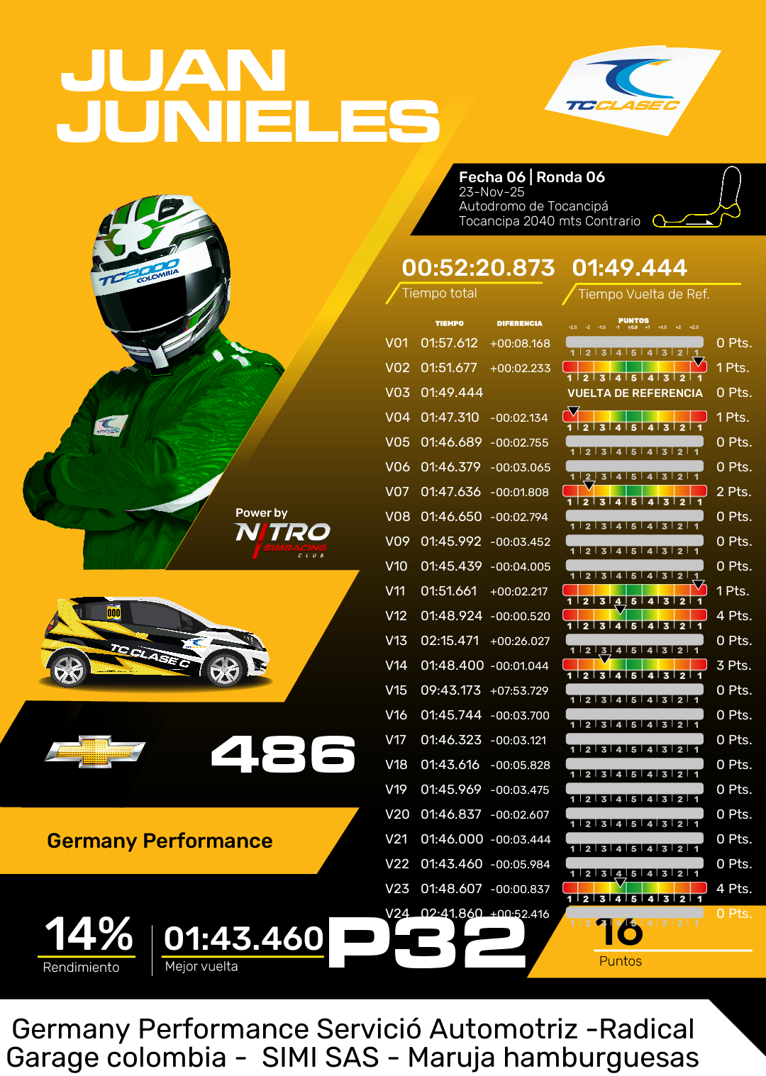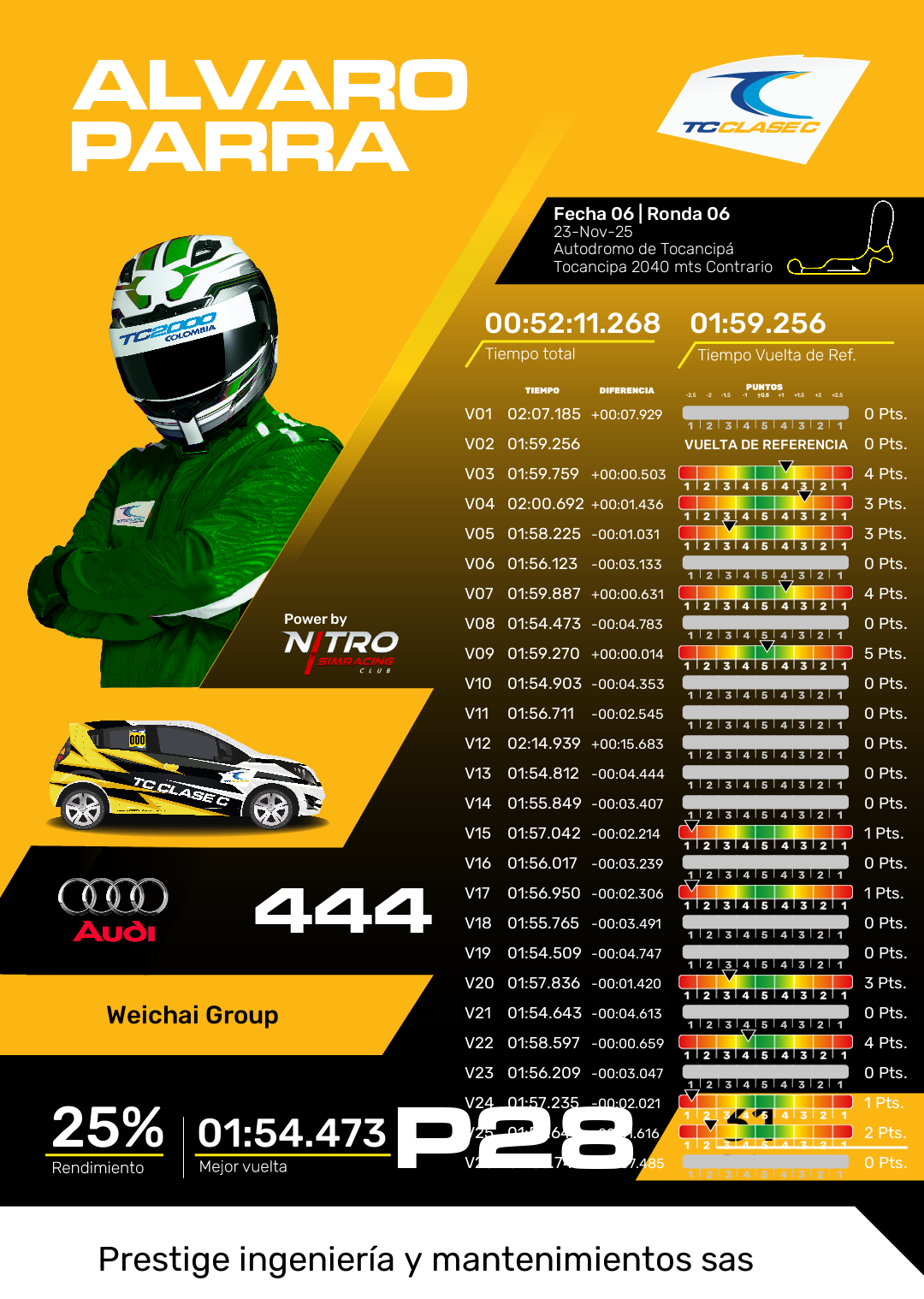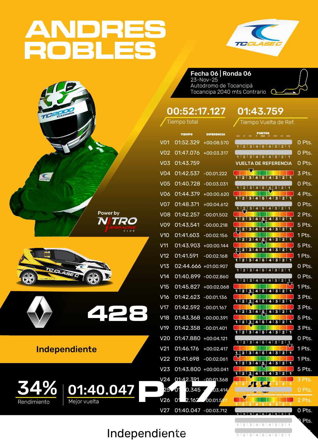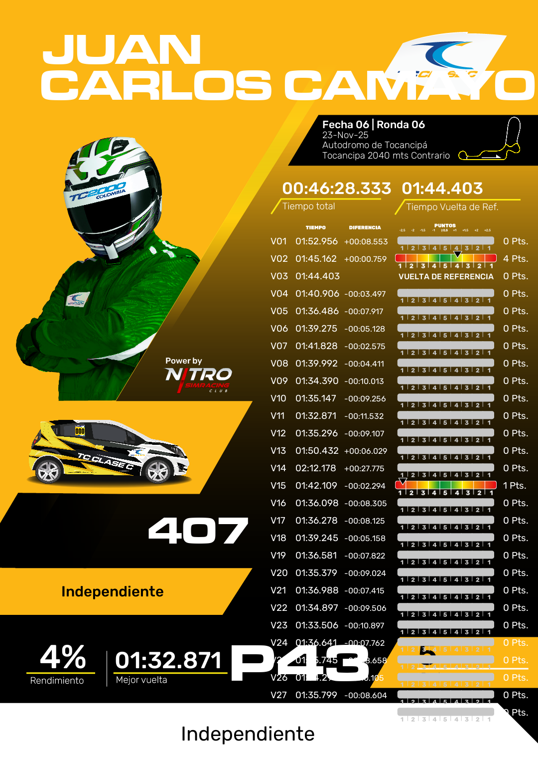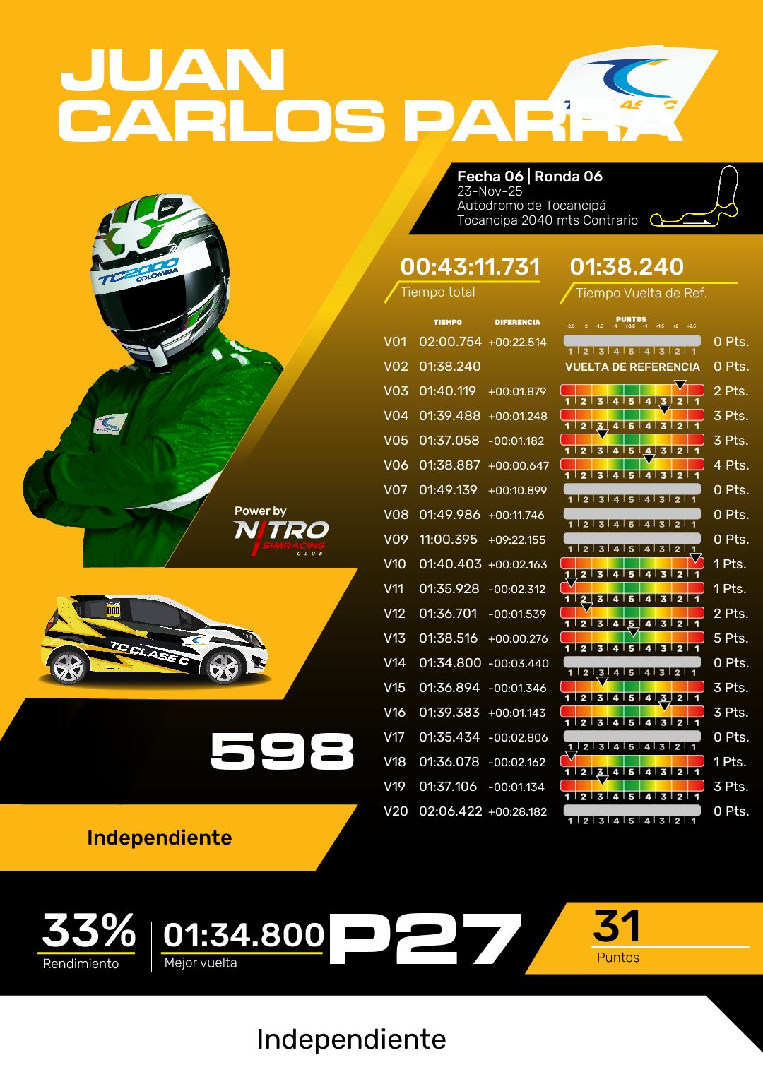 | Pos | #Coche / Auto | Piloto | Equipo | #V | T.Total | Giro V.Ref | Tiempo V.Ref | % Óptimo | Rendim | G.Punt | Prom.Giros | Pts | VER |