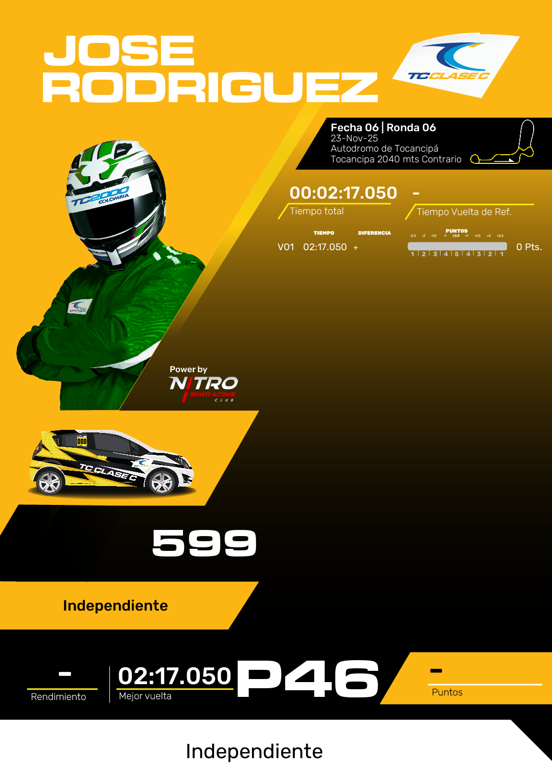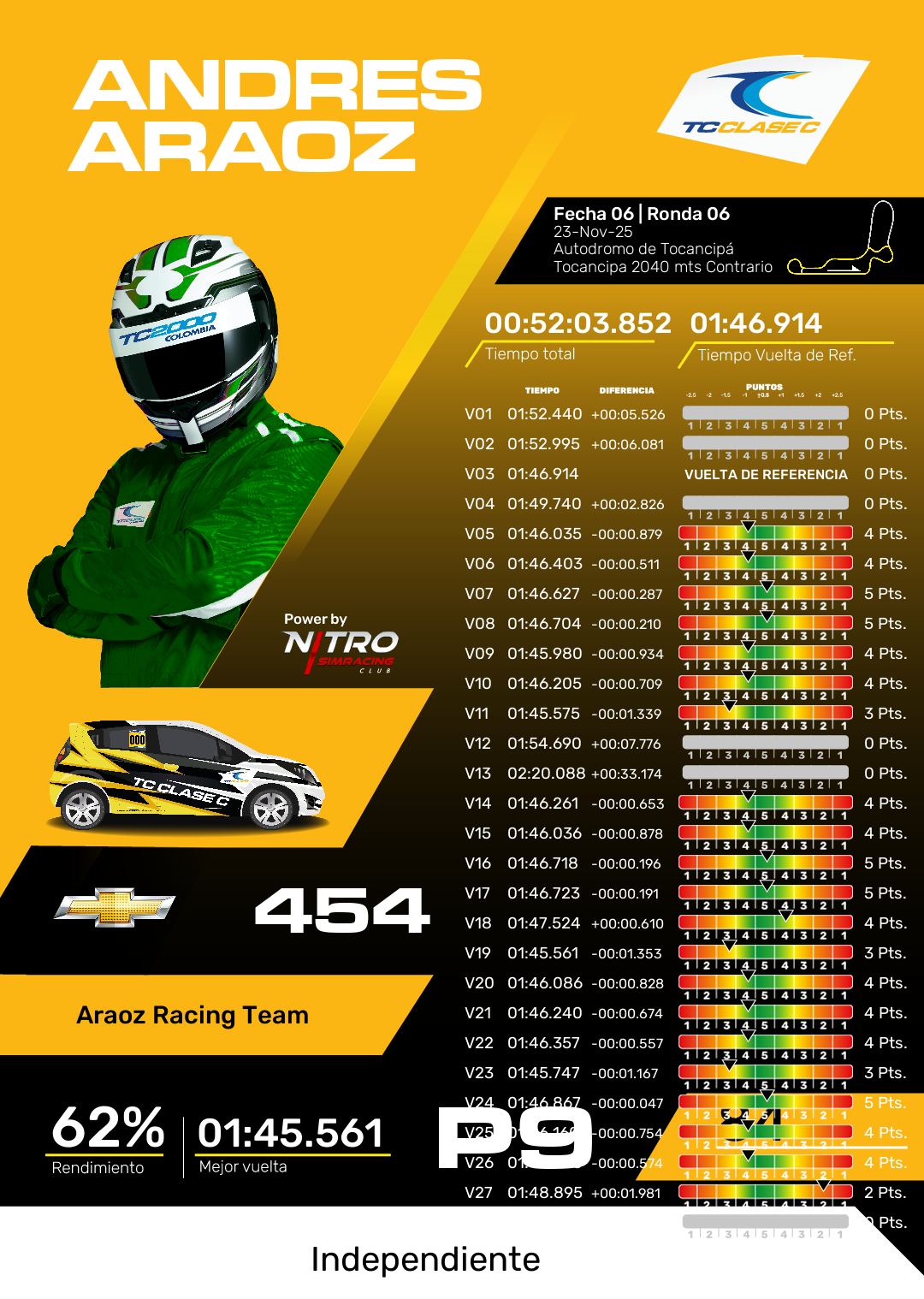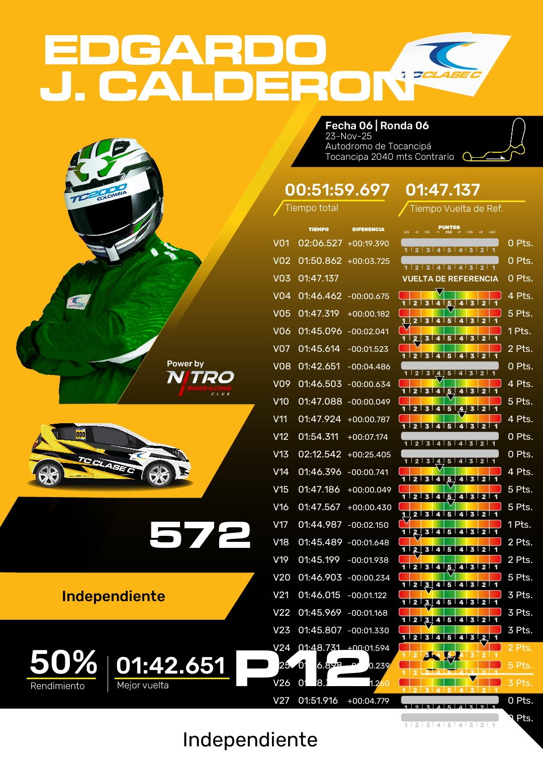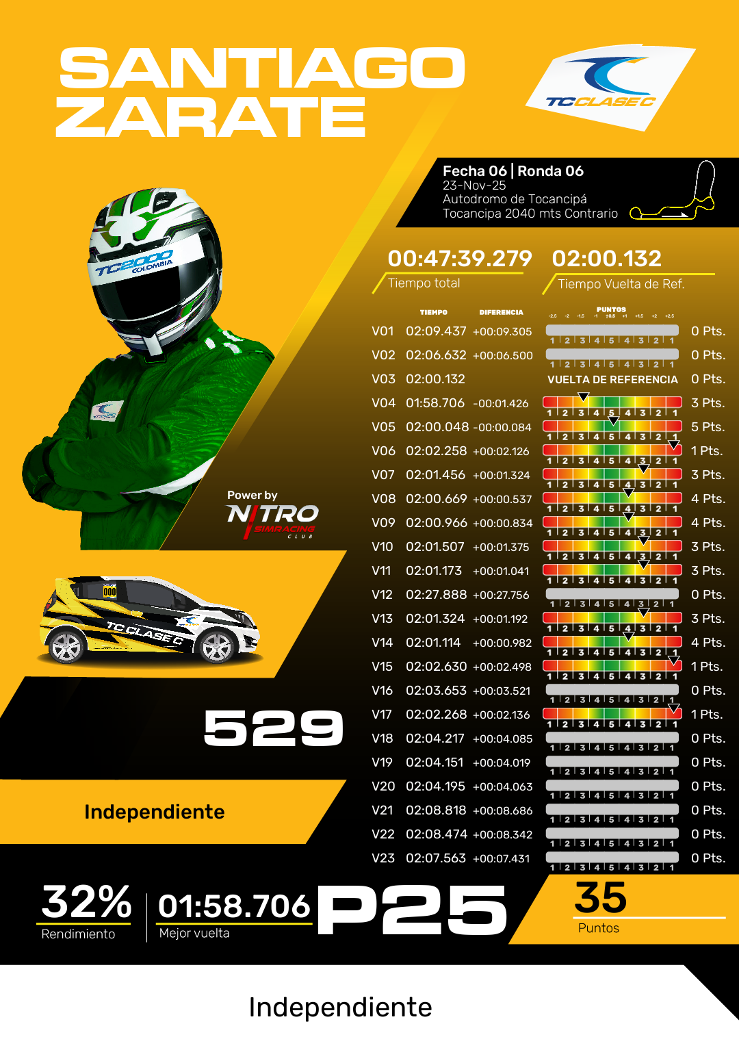 | Pos | #Coche / Auto | Piloto | Equipo | #V | T.Total | Giro V.Ref | Tiempo V.Ref | % Óptimo | Rendim | G.Punt | Prom.Giros | Pts | VER |