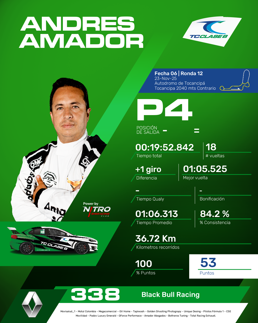 Black Bull Racing (Movisalud_1 - Motul Colombia - Megacomercial – GV Home - Tapiwash - Golden Shooting Photograpy - Unique Desing - Pilotos Fórmula 1 - CSE Movilidad - Padov Luxury Emerald - GForce Performace - Amador Abogados - Botheros Tuning - Total Racing Exhaust.) |